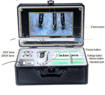 Máy có hai đầu soi: Một đầu soi cho tóc và một là cho da (đầu soi phóng đại 50 lần lúp led để soi da, Và đầu soi phóng 200 lần lúp led để soi tóc)